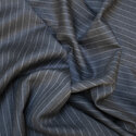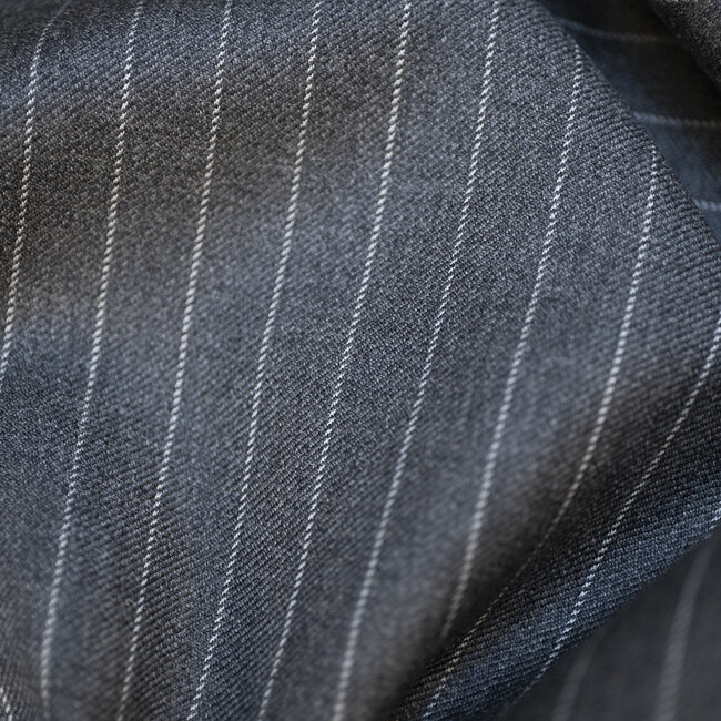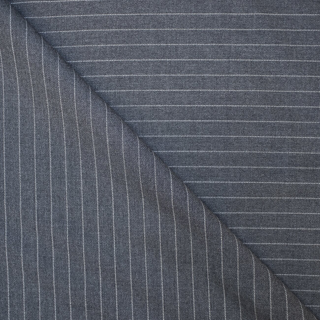 Laine super 110's gris moyen à rayures (espacement 10mm). Sa composition en pure laine donne de la souplesse au drapé de ce fin tissu peigné et son poids en assure un tombé élégant.
