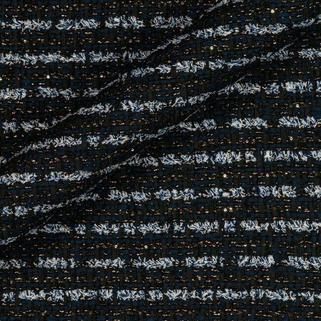 Tweed bnoir/bleu et doré élégant et moderne en fils denim spéciaux, fabriqué à partir d'un mélange de fibres exclusives qui le rendent parfait pour les occasions spéciales où la sophistication est essentielle.