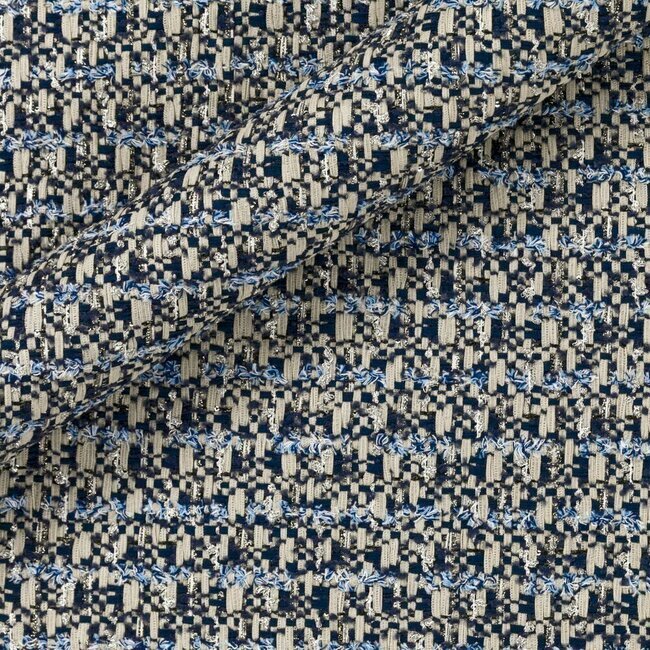 Tweed beige/bleu élégant et moderne et fils denim spéciaux de chez Carnet "Tweed collection", fabriqué à partir d'un mélange de fibres exclusives qui le rendent parfait pour les occasions spéciales où la sophistication est essentielle.