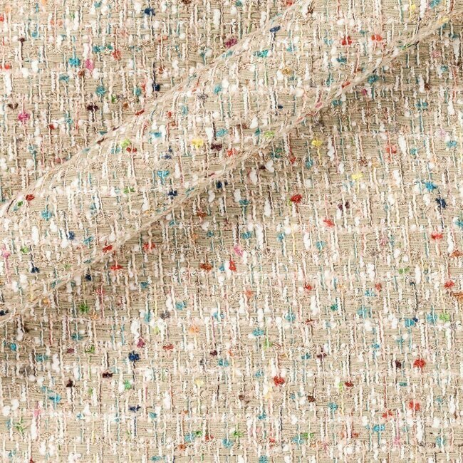 Tweed élégant et moderne en fils beiges/multicolores de chez Carnet "Tweed Collection", fabriqué à partir d'un mélange de fibres exclusives qui le rendent parfait pour les occasions spéciales où la sophistication est essentielle.